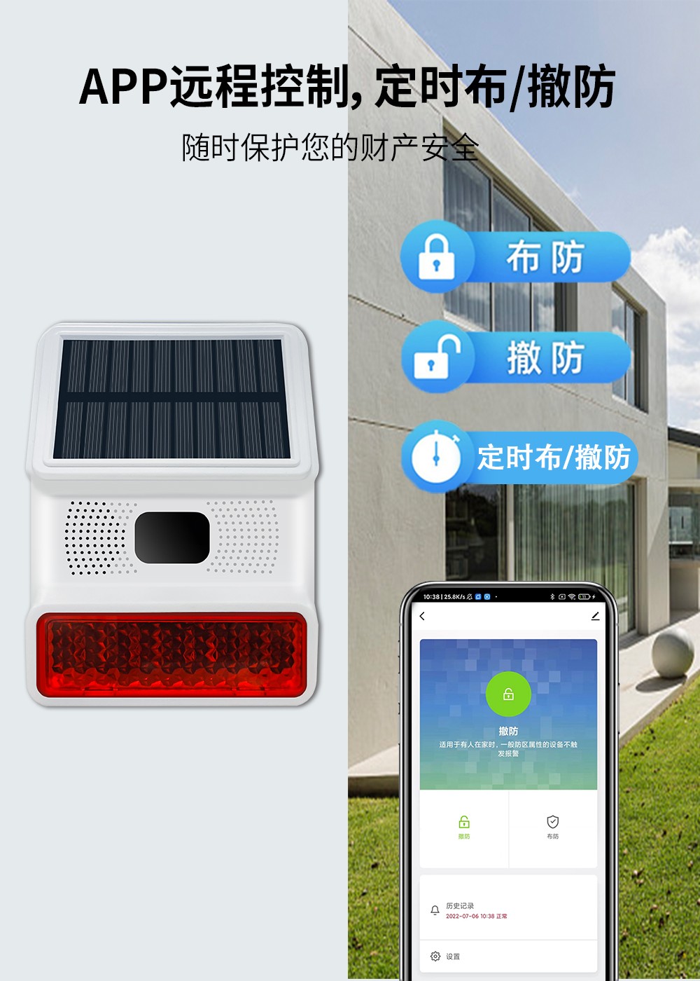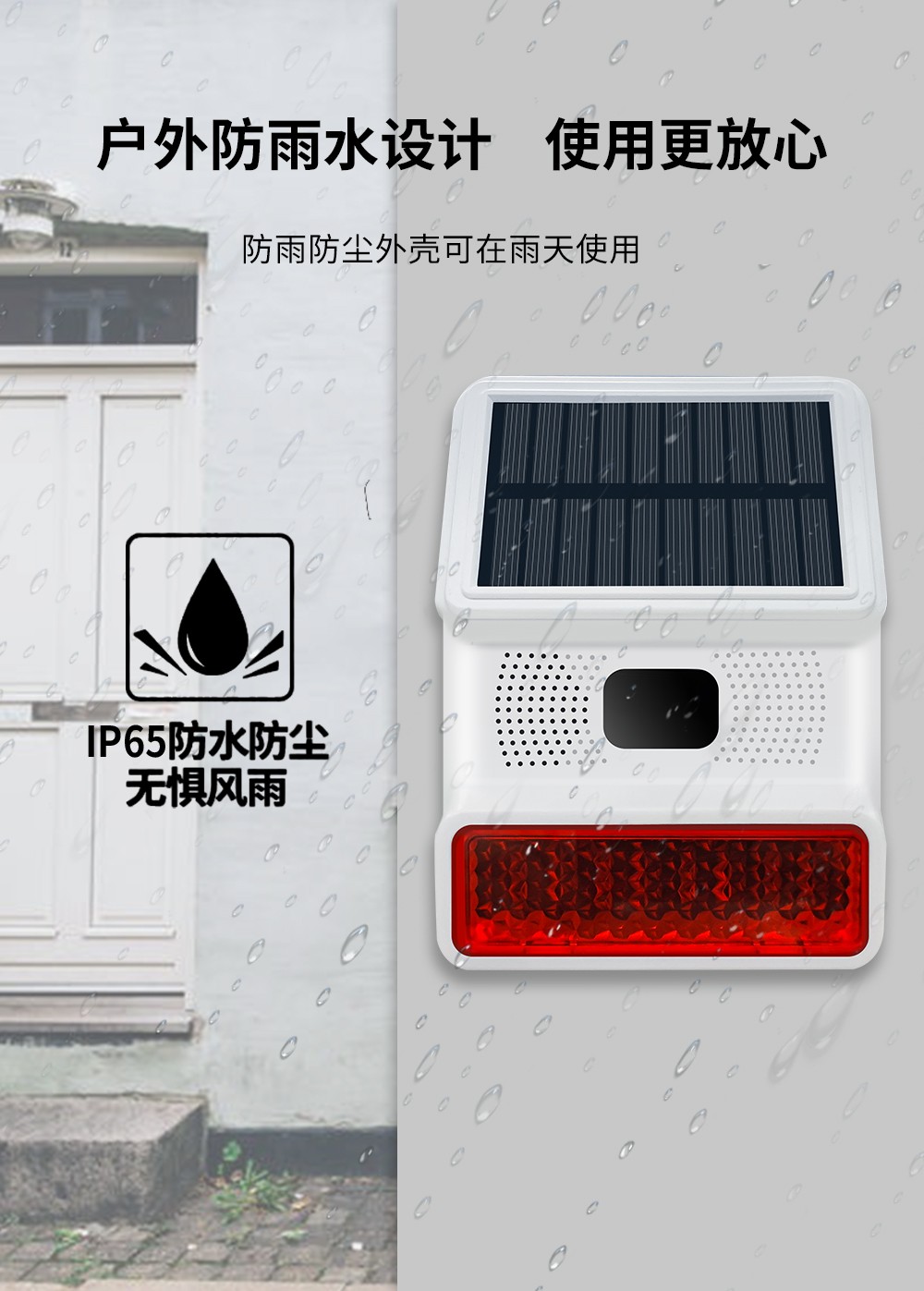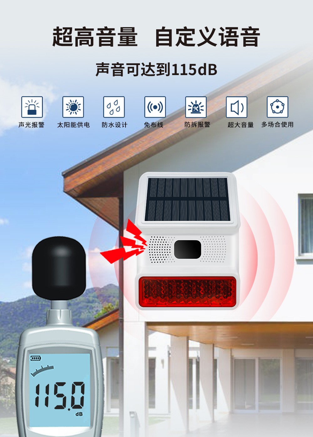 无线太阳能红外声光报警器分为联网型和RF型,探测距离8-12米,角度110度,这是一款可以自定义报警语音,高性能的带太阳能充电的户外数字被动红外现场声光报警器。能够有效防水、防尘、防虫、防风和其他户外干扰因素。该产品应用如下先进技术:超低功耗芯片技术,WiFi联网技术,NB/4G无线通讯技术,太阳能持续充电和供电,音频和高亮度闪灯同时报警提醒。使用稳定、性能先进、IP-65防水的整体结构设计,可以应用于商铺、别墅、养殖场、森林防火、高压电杆、公园、仓库、码头等一切需要现场语音和强光警示的地方。
